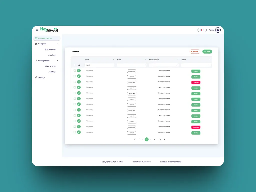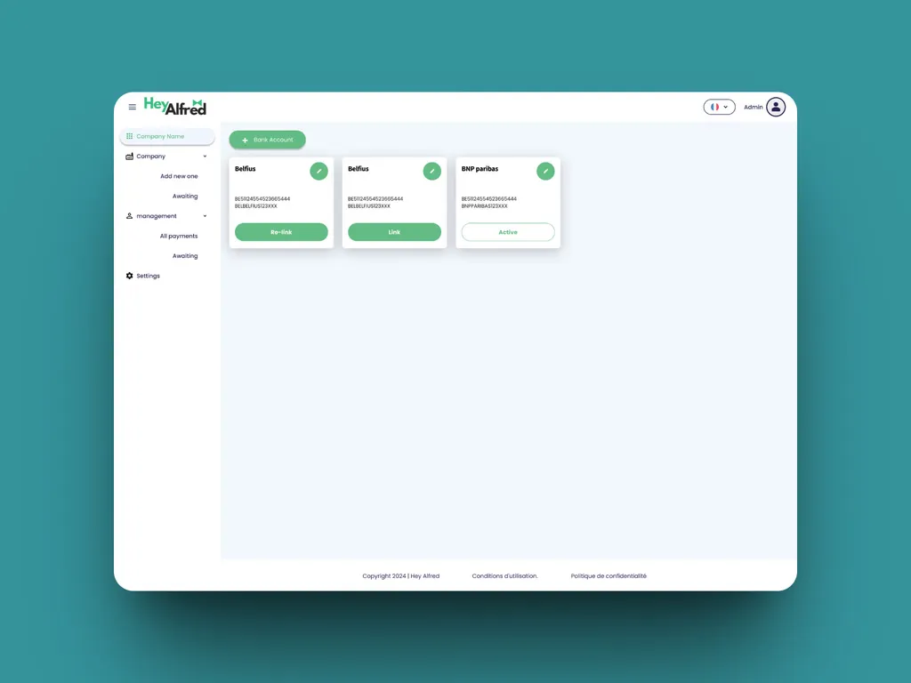 Hey Alfred Hey Alfred is a Proof of Concept secure web application designed to enable personal assistants to monitor their customers' bank accounts, schedule payments and have them validated by the customers themselves. The aim is to streamline financial management by delegating responsibility while ensuring rigorous control, in a highly confidential environment.