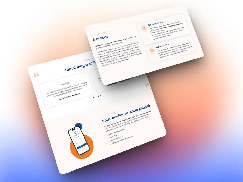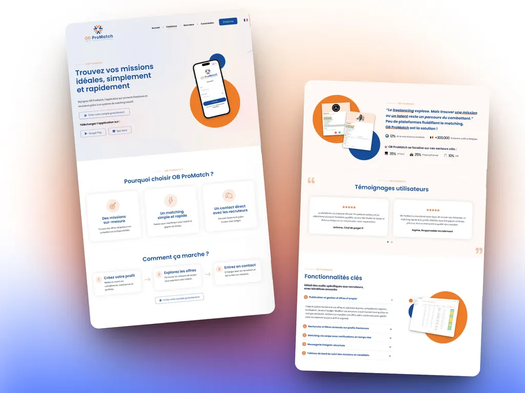 OB ProMatch is een oplossing die is ontworpen om getalenteerde mensen in contact te brengen met gespecialiseerde recruiters. Om zijn ontwikkeling te ondersteunen, had het merk een professionele website nodig om zijn positionering, diensten, methodologie en expertise op het gebied van matching duidelijk te presenteren.
